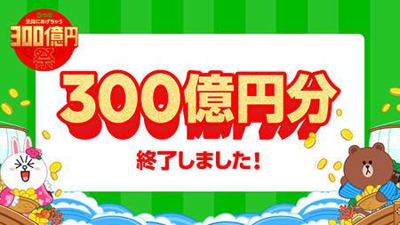 LINE Payは、6月10日、予定していた還元金額に到達したため、「祝!令和 全員にあげちゃう300億円祭(300億円祭)」を終了した。「300億円祭」は、LINEで友だち登録しているユーザーやグループに無料で1000円相当のLINE Payボーナスを送ることができるキャンペーン。5月20~29日の開催を予定していたが、付与する予定の「LINE Payボーナス」が100億円相当残っていたことを受けて、延期していた。