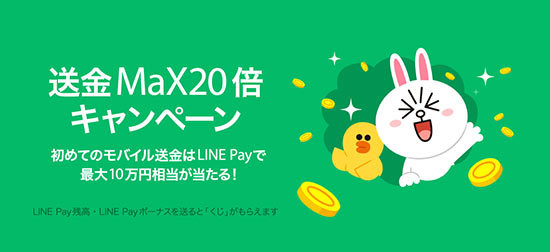 大規模なキャンペーンが終わったのも束の間、同日には「送金MaX20倍キャンペーン」を開始。「LINE」で友だち登録しているユーザーへ「LINE Pay残高」か「LINE Payボーナス」を送金すると、抽選で送った額の最大20倍(上限10万円)相当のLINE Payボーナスが戻ってくるというもの。