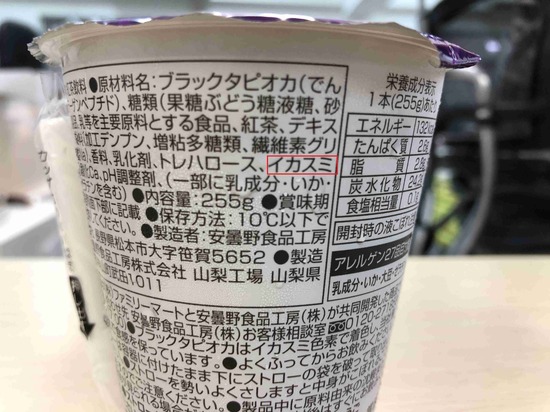 イカスミと甲殻類……。一見あまり関係ないように思えるが、全国いか加工業協同組合によると、甲殻類アレルギーの原因物質「トロポミオシン」はイカやイカスミにも含まれているという。なお『ファミマコレクション タピオカミルクティー』のイカスミ色素は、タピオカの着色に使用されているらしい。