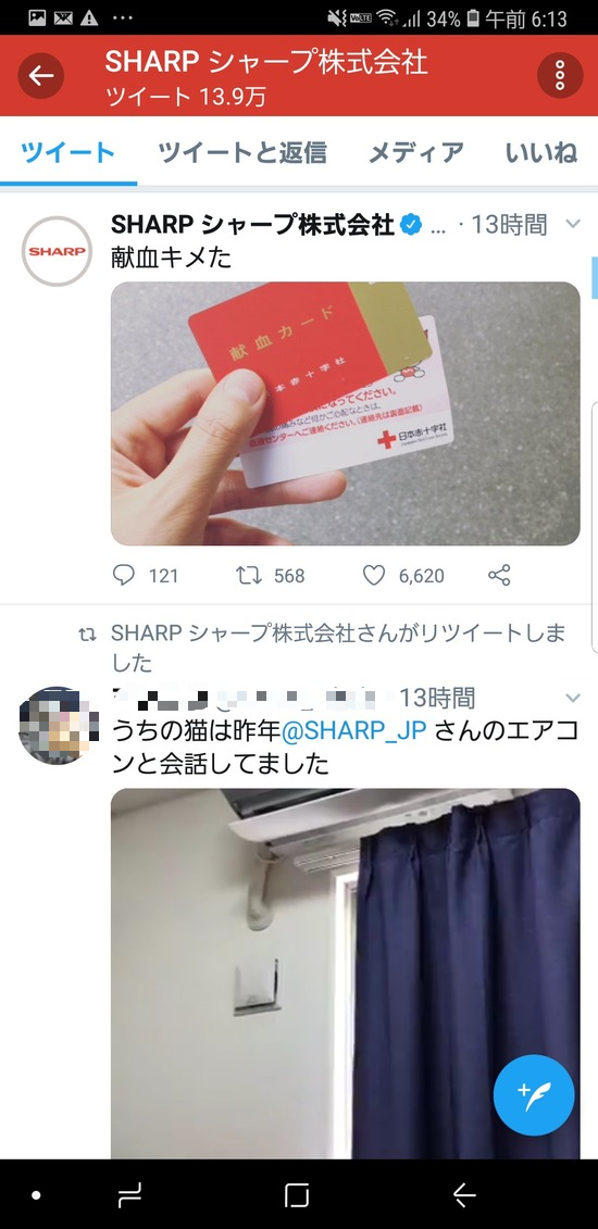 SHARP公式Twitter「献血キメた」「献血はのうのうと生きてるだけで人の役に立てる」