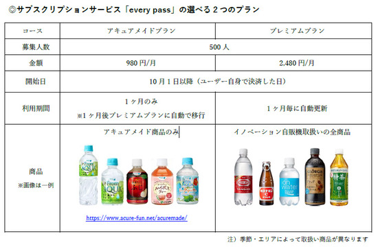 「プレミアムプラン」では月額2480円で「アキュアメイド」に加えて、他飲料メーカーを含むイノベーション自販機取扱いの全商品が対象となる。