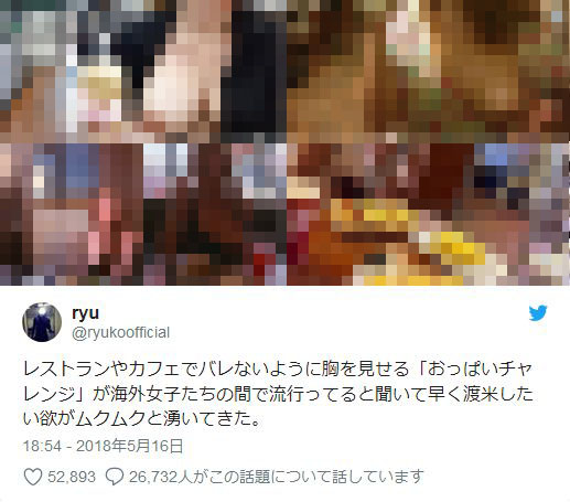話題となっている「おっぱいチャレンジ」は、飲食店やショッピングセンターや屋外などの人の集まる場所でバレないように胸を出し、画像や動画を撮影するというものです。海外で流行っており、Twitter(ツイッター)には飲食店などで女性が胸を出し撮影している画像が多数ありました。