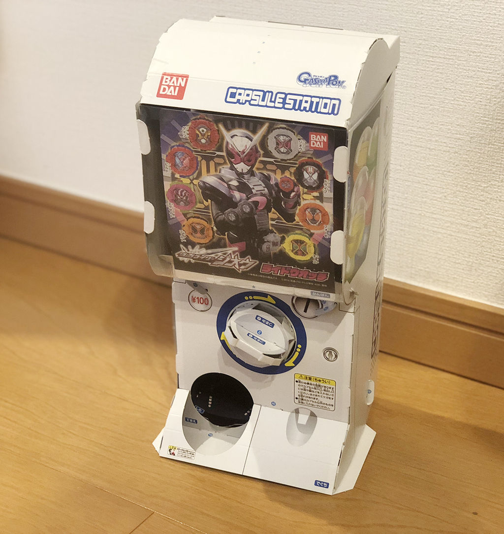 とんなわけで「つまみ(まわすところ)」、「本体」、「出口」などを順番に作り最後にカプセルを入れて完成。思った以上に完成度が高い。手前のつまみを回すとちゃんとカプセルが出てくる。コインを入れたりすることはできないが、それでも十分な再現度だろう。