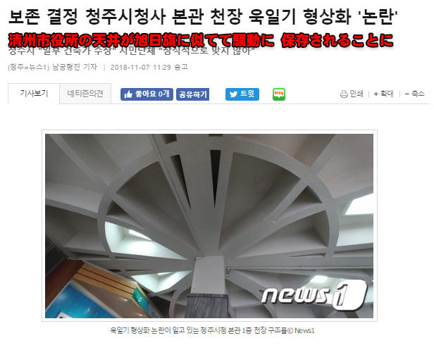 韓国の清州市(チェンジュ)役所本館1階の天井の作りが旭日旗に見えると韓国で騒動になっている。旭日旗は韓国では「戦犯旗」とも呼ばれ、軍事主義を象徴する旗。11月7日、市によると6日に市庁舎建設特別委員会は3回の会議を行い、本館をそのまま維持することを決定。